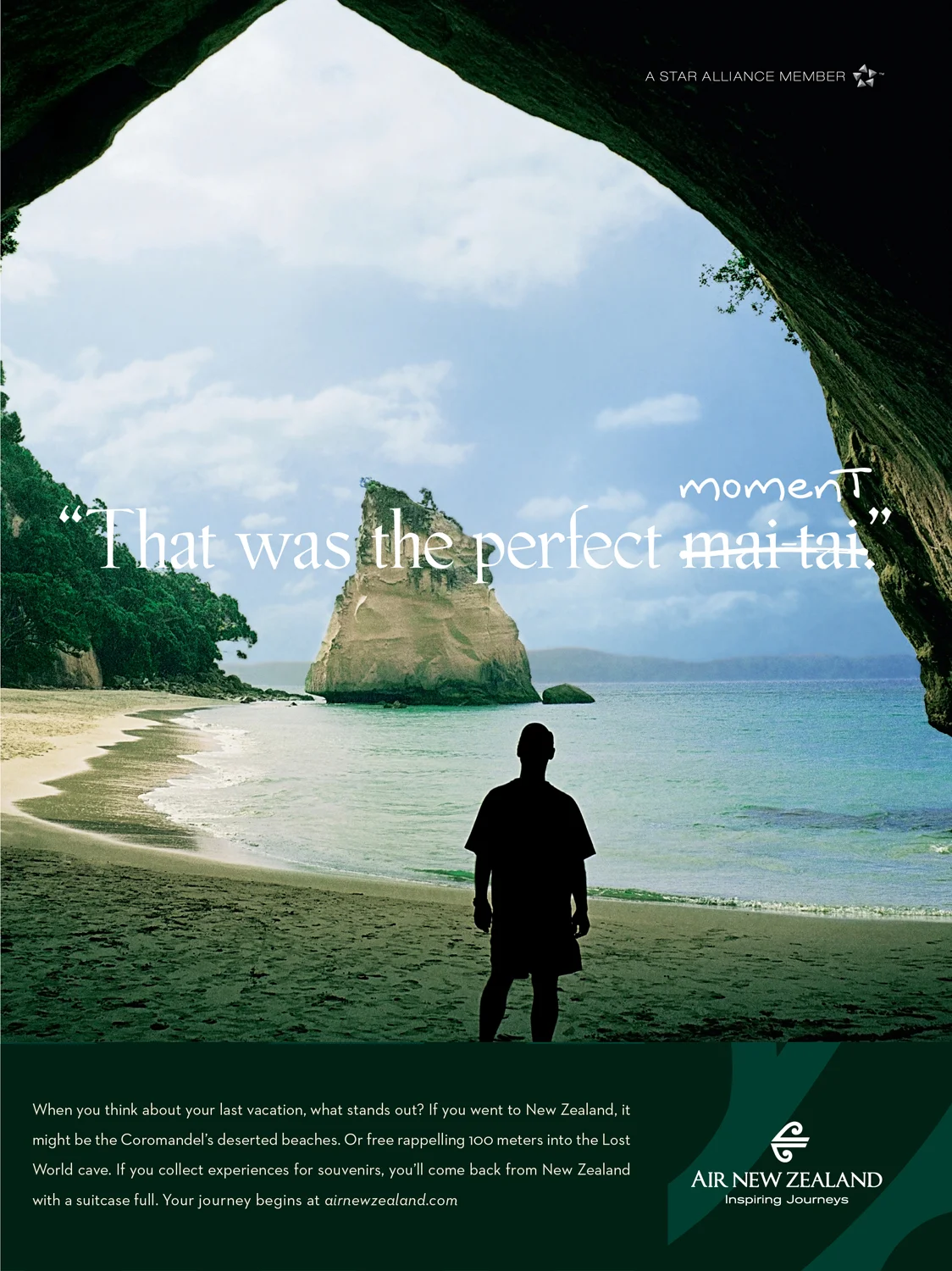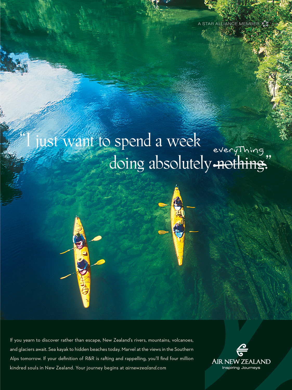 There are thousands of places you can go to lie on a beach and sip umbrella drinks. But that wasn’t where Air New Zealand would take you. So we positioned New Zealand as a place you’d go to experience amazing things. Instead of zoning out.